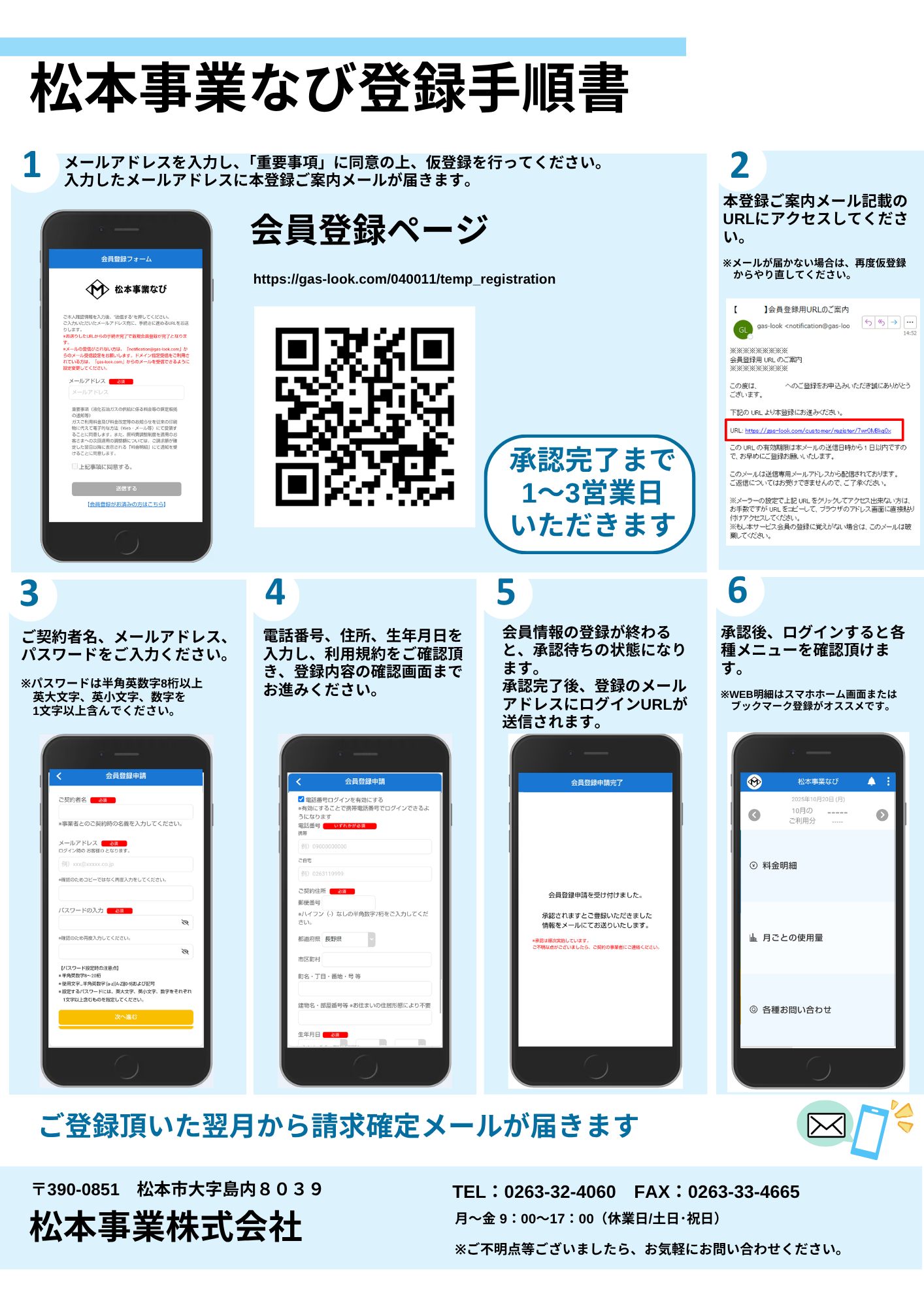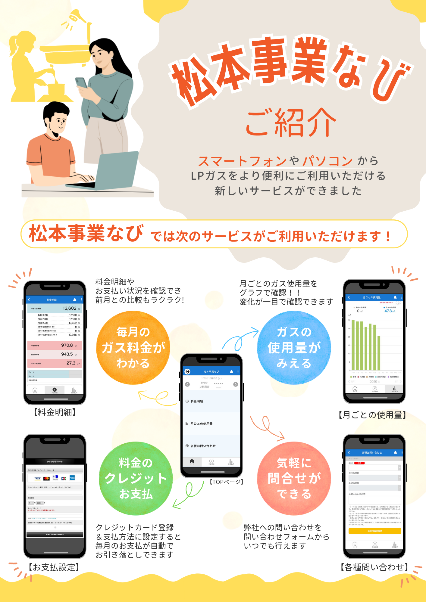 「松本事業なび」では、ガスの使用量の確認、請求内容の閲覧、点検や工事に関するお問い合わせ、クレジットガードのお支払いなどを、